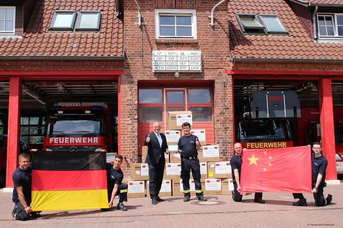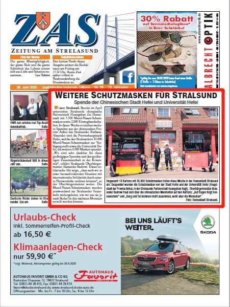 物资顺利抵达该市后,施特拉尔松德市政府举行了简单且庄重的接收仪式,巴德洛夫市长及该市应急管理队伍手持中德两国国旗,感谢中国朋友雪中送炭的支持。该市政府网站及当地多家媒体对此进行了报道。《施特拉尔松德报》6月28日头版头条刊登以《我们有了更多的口罩——来自中国合肥学院的捐助》为题的报道,感谢我校在疫情危急时刻的慷慨援助,同时对我校在口罩包装盒上张贴的祝福标语“雨过天晴终有时”、“山和山不相遇,人和人要相逢”,深表感激。
