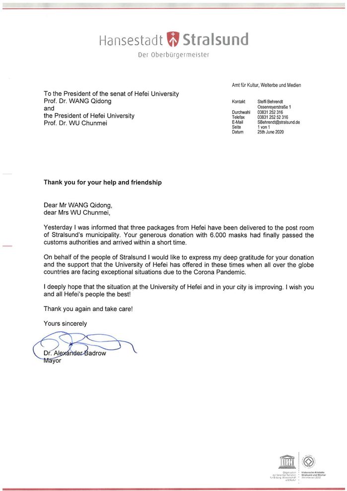近日,德国施特拉尔松德市市长亚历山大·巴德洛夫博士代表该市政府和市民致信我校党委书记王其东和校长吴春梅,由衷感谢我校向该市捐赠6000只医用口罩,并祝愿我校全校师生及全体合肥市民安康。