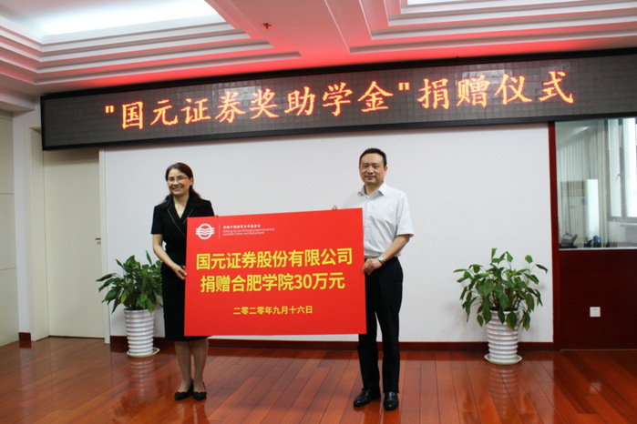 9月16日下午,合肥学院举行2020年度“国元证券奖助学金”捐赠仪式。国元证券股份有限公司党委副书记、监事会主席、工会主席蒋希敏一行四人,合肥学院副校长、安徽中德教育合作基金会(以下简称基金会)理事长陈秀,校计划财务处处长、基金会秘书长何世昆,校党委委员、学生处处长、基金会事业发展部副部长朱涛,校经济与管理学院院长陈江华等相关部门老师,以及获得上一年度奖助学金的学生代表参加了捐赠仪式。仪式由基金会管理办公室主任刘金平主持。