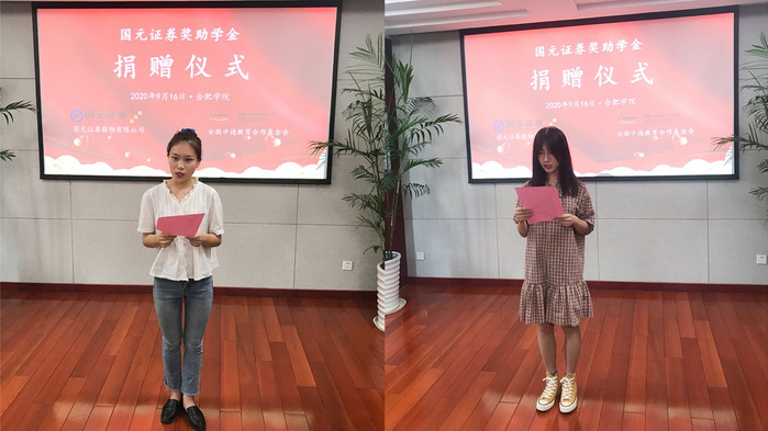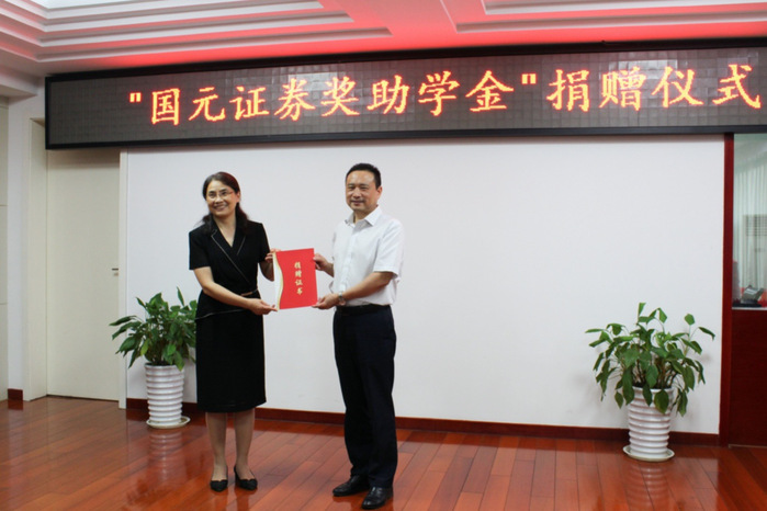 捐赠仪式上,双方举行捐赠标牌递送仪式。陈秀代表基金会向国元证券颁发捐赠证书。朱涛宣读了学校关于“国元证券奖助学金”的授予决定,蒋希敏为获奖学生代表颁发证书。经济与管理学院2018级本科生江梓晓、语言与文化传媒学院2017级本科生吴楠分别代表奖学金、助学金获得者发言。