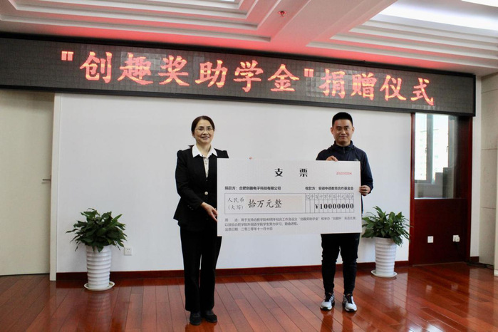 捐赠仪式上,双方签订捐赠协议。方成俊代表合肥创趣电子科技有限公司向基金会递送捐赠支票。陈秀代表基金会向合肥创趣电子科技有限公司颁发捐赠证书。