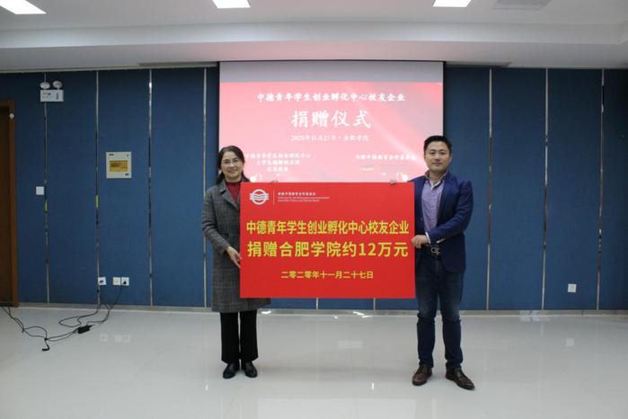 11月27日上午,我校举行中德青年学生创业孵化中心(以下简称孵化中心)校友企业捐赠仪式,合肥学院副校长、安徽中德教育合作基金会(以下简称基金会)理事长陈秀出席。校计划财务处处长、基金会秘书长何世昆,校孵化中心主任刘沛平和副主任孙虹,基金会管理办公室副主任周舟以及孵化中心21家校友企业代表参加了捐赠仪式。仪式由基金会管理办公室主任刘金平主持。
