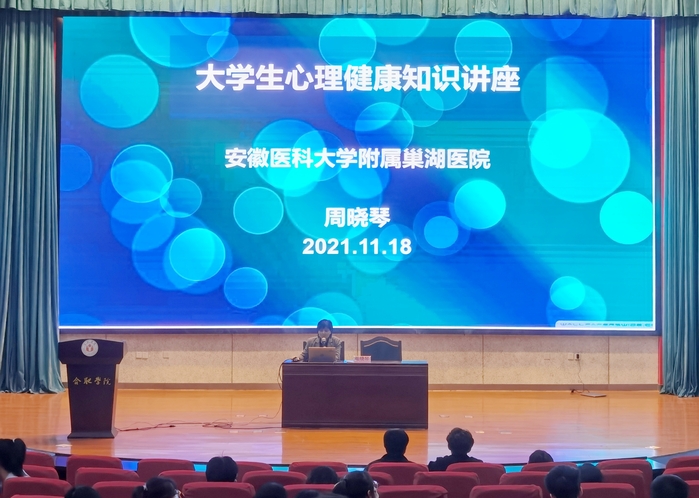 11月18日下午,我校在图书馆学术报告厅A厅举办了心理委员培训暨心理健康教育专题讲座。本次讲座主讲人为安徽医科大学附属巢湖医院精神科主任周晓琴。我校党委学生工作部副部长、学生处副处长张应杰,各二级心理工作站负责老师和2020级、2021级班级心理委员近200人一起聆听了本次讲座。讲座由学生处心理健康教育与咨询中心副主任谢琛主持。