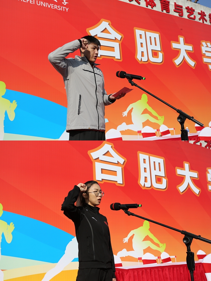 经济与管理学院2022级国际经济与贸易专业学生、第27届全国大学生击剑竞标赛个人和团体冠军获得者王凯霆和公共体育与艺术教学部欧阳井凤老师代表全体运动员与裁判员宣誓。