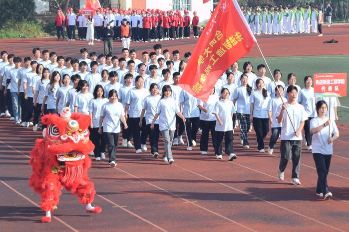 伴随着雄浑激昂的《运动员进行曲》,国旗队方阵高擎国旗率先入场,各二级学院、国际学生、研究生代表队紧随其后,迈着矫健的步伐依次走过主席台前方。“青春激昂,气质恢宏,先进领航”“厚德博学,扬我合大奋进风;善思致用,做我材化拼搏人”……口号声此起彼伏,掷地有声。整齐划一的步伐、迎风飘扬的旗帜,展现着全校运动健儿们意气风发、拼搏进取的精神风貌。