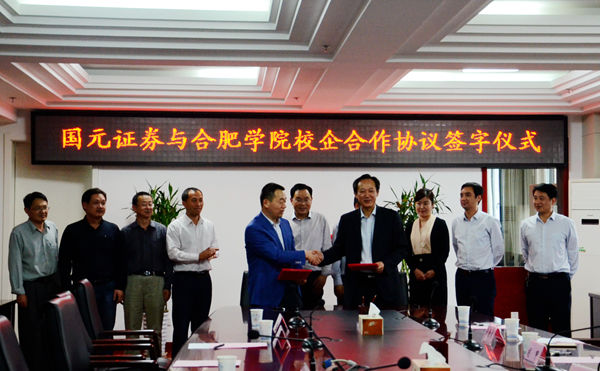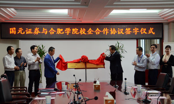 张文兵介绍了学校的发展历史、国际化办学、教育教学改革与创新等方面的举措和取得的成果,指出了加强校企合作对于提升我校经管专业应用型人才培养质量的重要性。俞仕新介绍了国元证券股份有限公司的发展,认为合肥学院应用型人才培养模式完全符合证券公司业务综合性、多元化的发展趋势和公司营业网点相关岗位的工作需求。双方就人才培养、投资者教育、专业建设等领域的合作达成一致意见,签署了校企合作框架协议,共同为合作基地揭牌。最后,双方均表示要以协议签署为契机,携手共进,共谋发展。