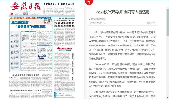 “书中的知识、实验室里的数据,在生产线上得到了检验。”郎满权说,有两位导师在为他“保驾护航”:企业导师会在实操上从行业经验的角度为他答疑;而学校导师可以提供学术和专业方面支持,把原先不懂的原理在实际案例中深入浅出地讲解清楚。两位导师不仅帮助他解决了实际问题,更让他逐步看清专业发展方向,明晰了职业规划。