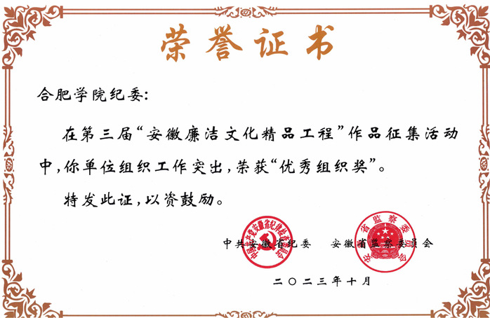 此前,纪委发布了《关于合肥学院廉洁文化作品征集的通知》,得到了全校师生的积极响应,共征集廉洁文化作品150余件,评出校级一等奖6个、二等奖8个、三等奖20个、优秀组织奖6个,获奖作品在合肥学院纪检监察网线上展播,并择优推选了6件作品参加第三届“安徽廉洁文化精品工程”作品征集展播活动,最终2件作品脱颖而出。