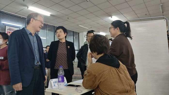4月15日下午,学校在图书馆一楼就业招聘大厅举办2024年合肥市工商联合会、明光市专场招聘会。党委书记王其东在学生处等相关单位负责人的陪同下到现场了解招聘情况,并与企业面对面交流。合肥市政协副主席、合肥市工商联主席姚亚妹、明光市人社局局长蔡峰等到现场考察。