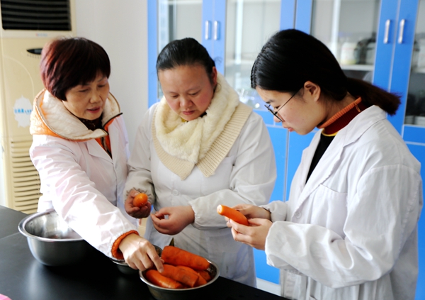 采访过程中,在面积不大的实验室中,由王中凤科技攻关项目聘用的科研助手饶银环正在专心地制作蔬果蛋酱。2014级食品科学与工程专业的学生陈巴丽正做她的毕业论文实验(探究蛋清热凝固性及抗热凝方法),她熟练地操作着试验台上的瓶瓶罐罐。陈巴丽在她自己的实验空隙还帮着饶银环处理蔬果。陈巴丽告诉我们,王老师常常会给那些未来想要从事科学研究的学生提出务实建议,“她要求我们求真务实、脚踏实地;要耐得住寂寞,守得住清贫,经得起失败;需要静得下心去学习,去实验,去思考。”她还告诉我们,“王老师是一位个性耿直的可爱老师,她的课上得也很生动性,非常受欢迎,能让让枯燥的理论知识与生产实际和现实生活相融相冾。”王中凤说,“我基本上采用互动式的课堂教学,通过互动调动和激发学生的思维与兴趣,活跃课堂气氛。”